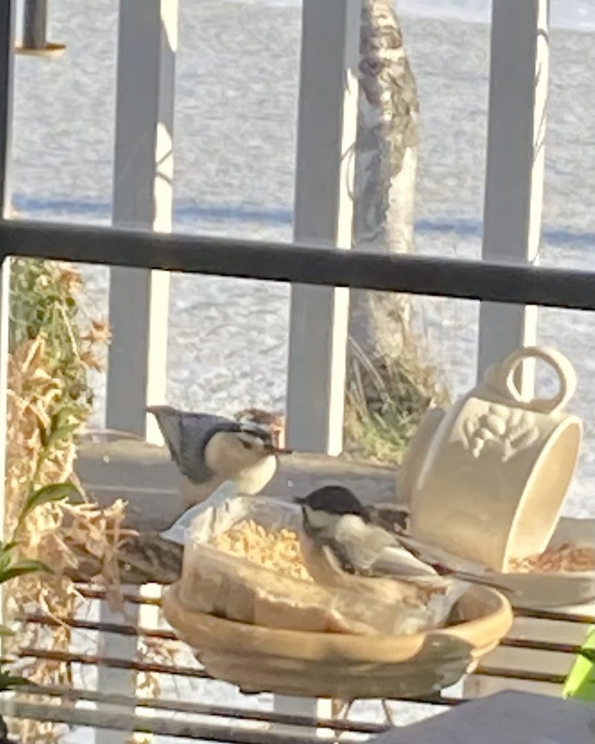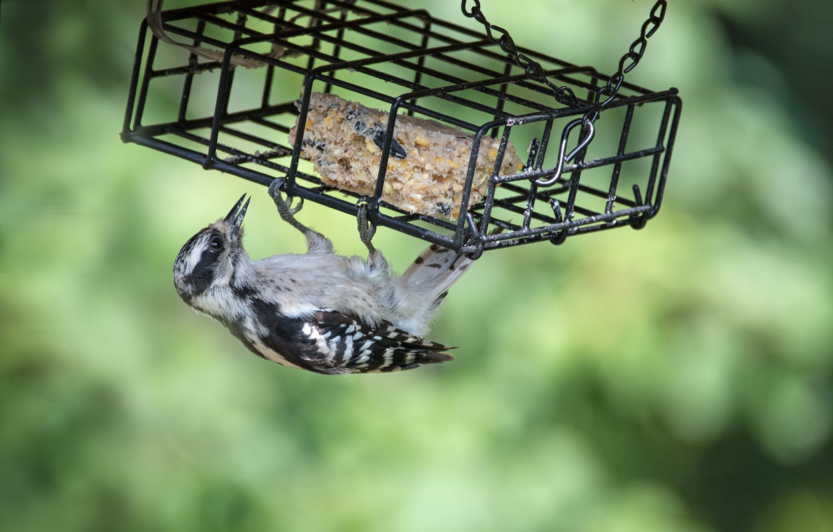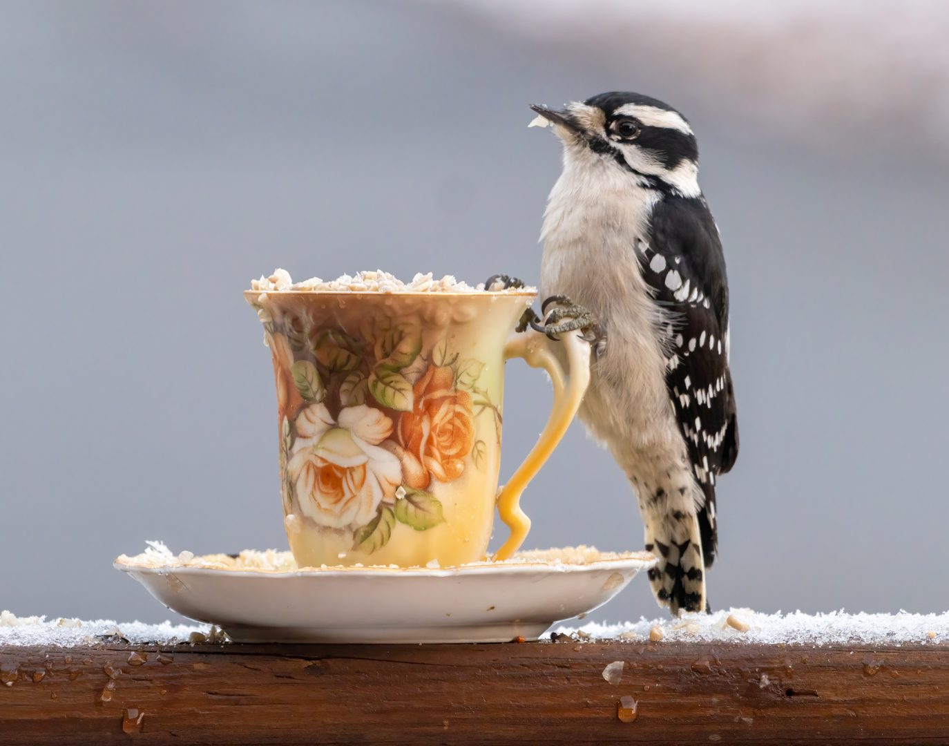 A suet tea party for my downy woodpecker friend