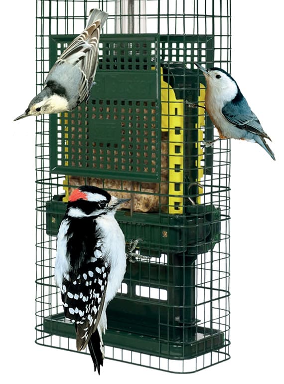 The Squirrel Buster® Suet takes the standard size suet cakes 4,5″ x 4,5″ x 1,5″. We recommend a suet cake with nuts and seeds.